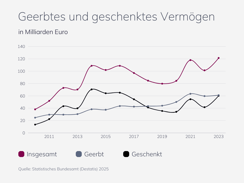 Aktuelle Statistiken belegen: Die Deutschen möchten zunehmend Vermögen an ihre Angehörigen weitergeben – durch Erbschaften und Schenkungen. Allein im Jahr 2023 rund 121 Milliarden Euro, laut Finanzverwaltungen. Das entspricht einem Anstieg von fast 20 % gegenüber dem Vorjahr. Insbesondere Schenkungen, oft zur optimalen Nutzung von Freibeträgen eingesetzt, stiegen um über 44 % an. [Quelle: Statistisches Bundesamt]