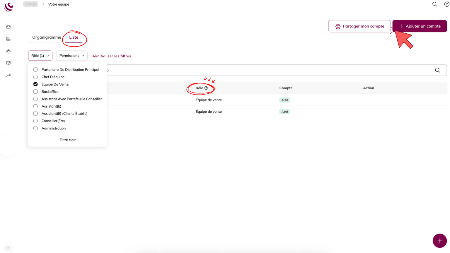 Filtrez, au besoin, par « Rôle » ou par « Permissions ».