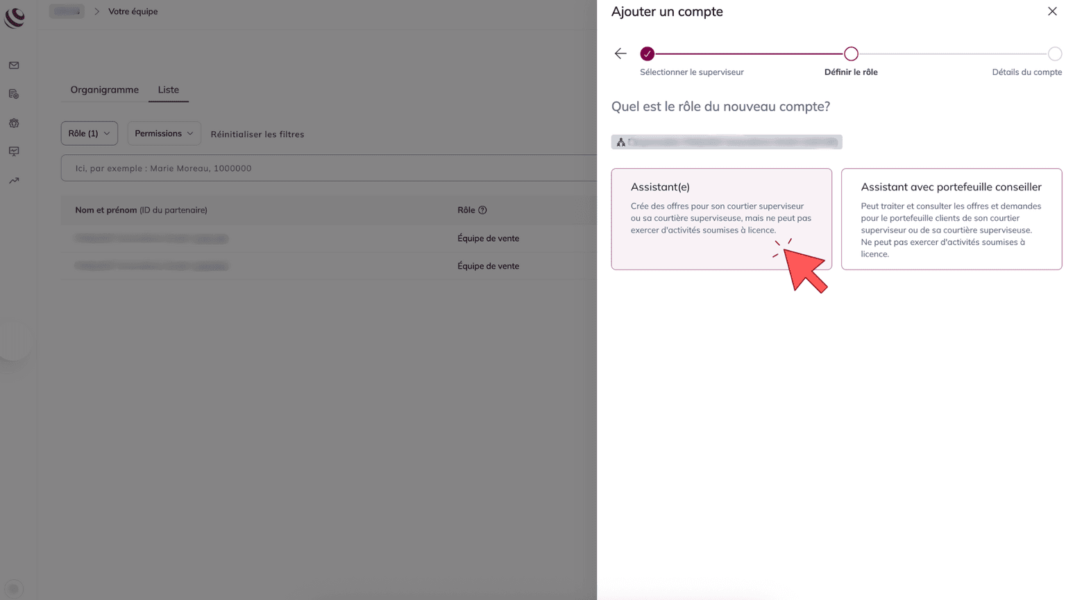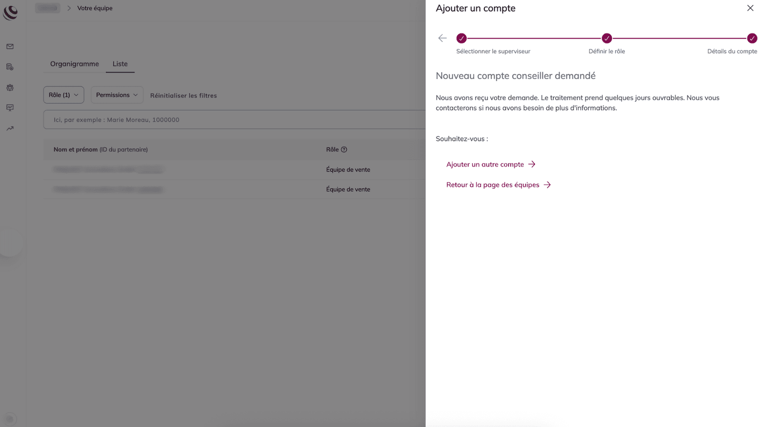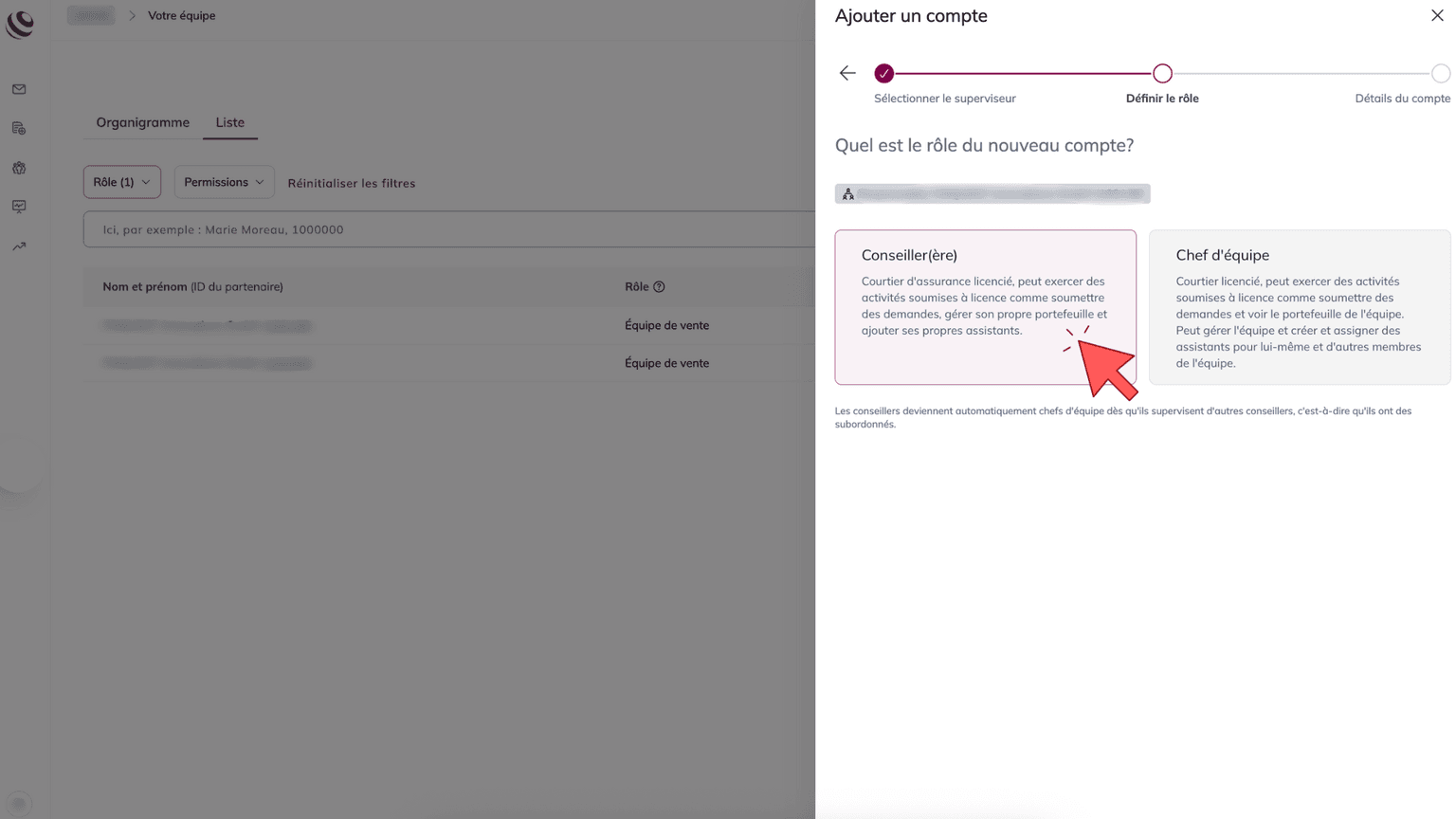 Le rôle de Chef d’équipe est créé automatiquement lorsqu'un·e conseiller·ère est associé à un ou plusieurs autres comptes subordonnés.