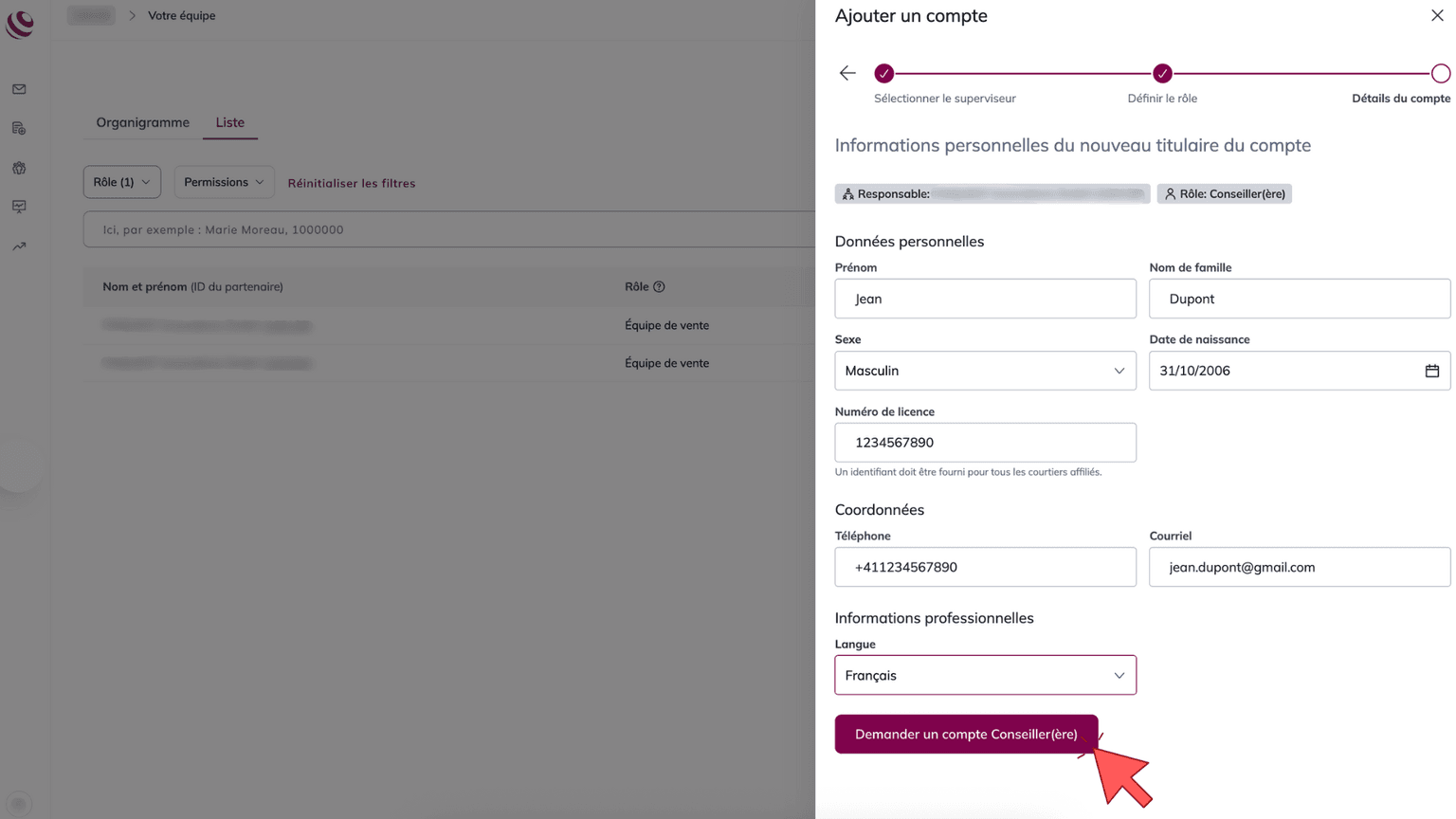 En tant que conseiller·ère ou chef d’équipe, ainsi qu’en tant que partenaire de distribution principal(e), assistant·e avec portefeuille ou administration, vous voyez en haut le bouton Ajouter un compte.
