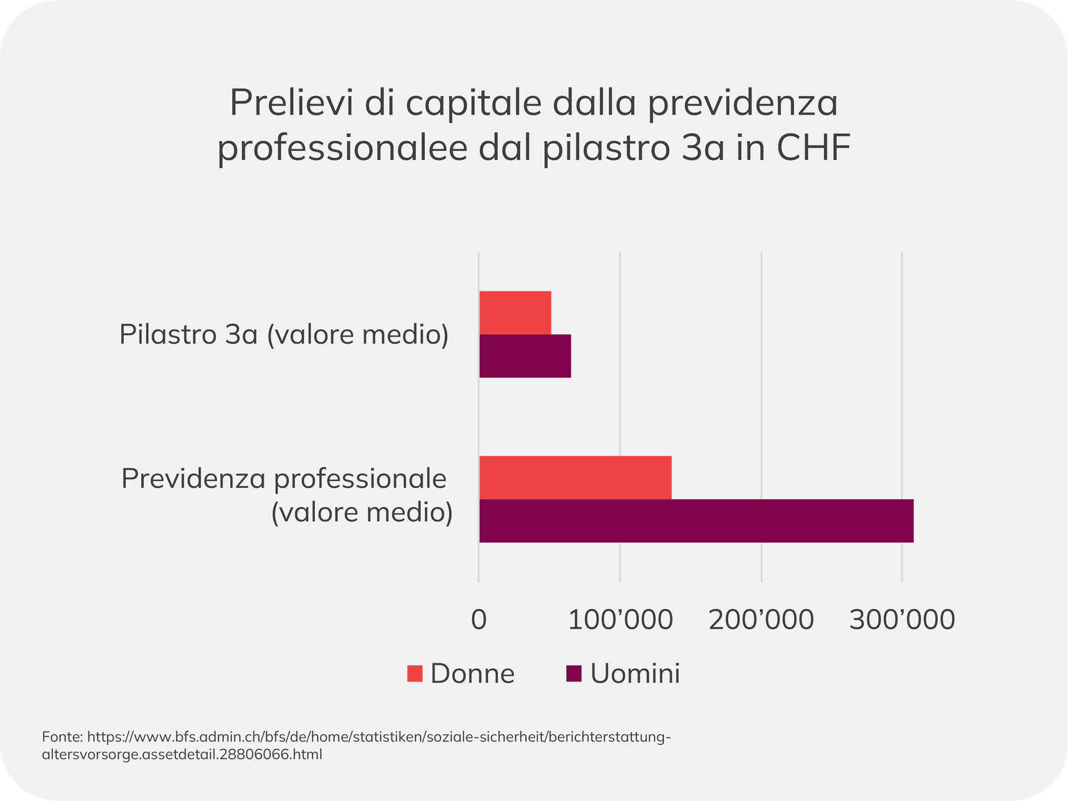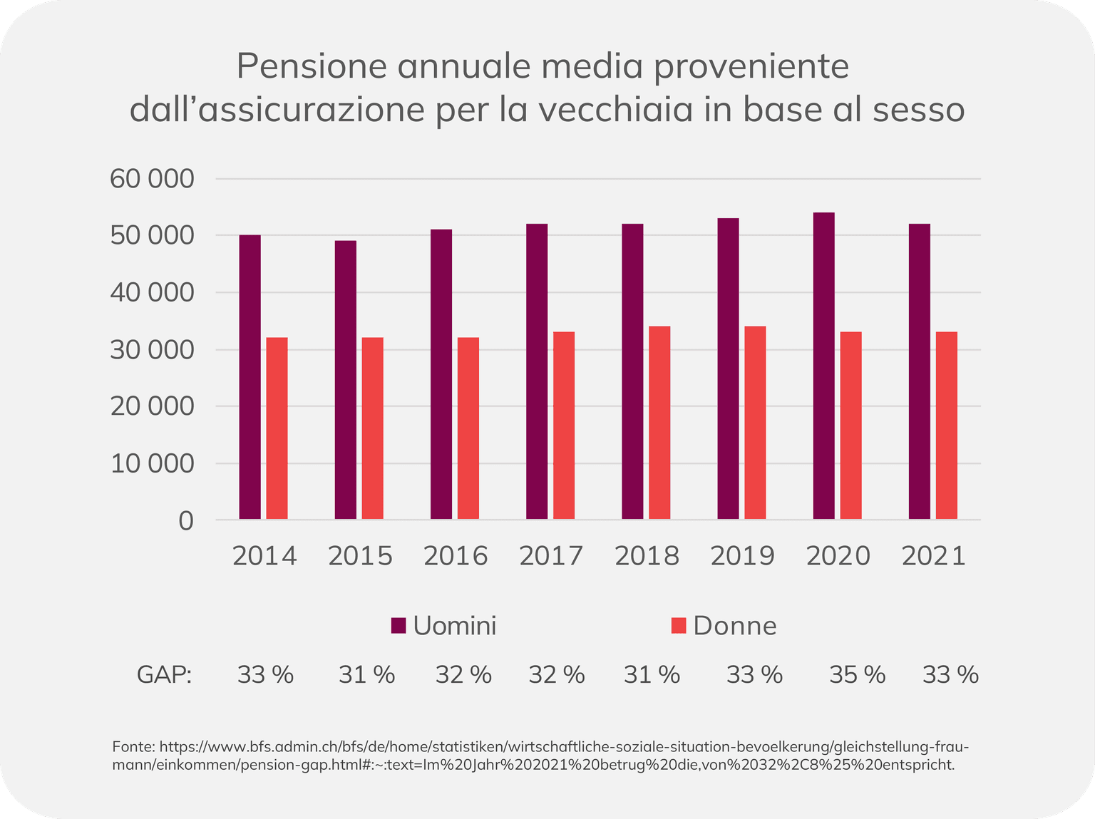 - Nel 2021 la pensione annuale media delle donne è stata inferiore di CHF 17’293 rispetto a quella degli uomini.